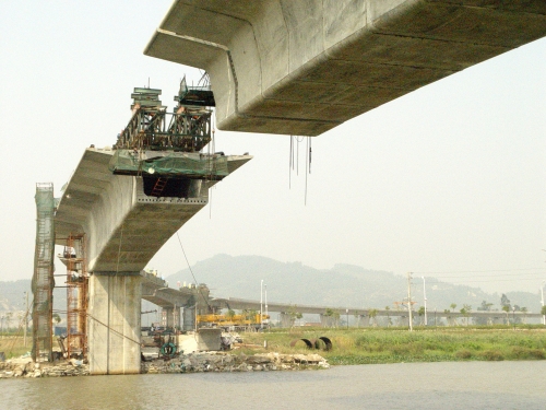 該標(biāo)段全長(zhǎng)1.972公里,其中簡(jiǎn)支梁橋長(zhǎng)0.7公里。連續(xù)梁懸拼、簡(jiǎn)支梁拼裝是地鐵四號(hào)線的兩大施工難點(diǎn),特別是連續(xù)梁懸臂拼裝是國(guó)內(nèi)首次應(yīng)用于地鐵施工。項(xiàng)目部自行設(shè)計(jì)簡(jiǎn)易吊裝設(shè)備,采用無(wú)底吊籃優(yōu)化施工工藝,用電腦模擬拼裝來(lái)指導(dǎo)施工,并采用濕接縫或墊鋼片等方法細(xì)心糾正因預(yù)制帶來(lái)的偏差,確保連續(xù)梁懸臂拼裝的準(zhǔn)確性。簡(jiǎn)支梁采用專門(mén)從挪威訂做的架橋機(jī)拼裝,較好地解決了簡(jiǎn)支梁半徑?。ň€路平面最小半徑僅30米)、不易安裝的問(wèn)題。
