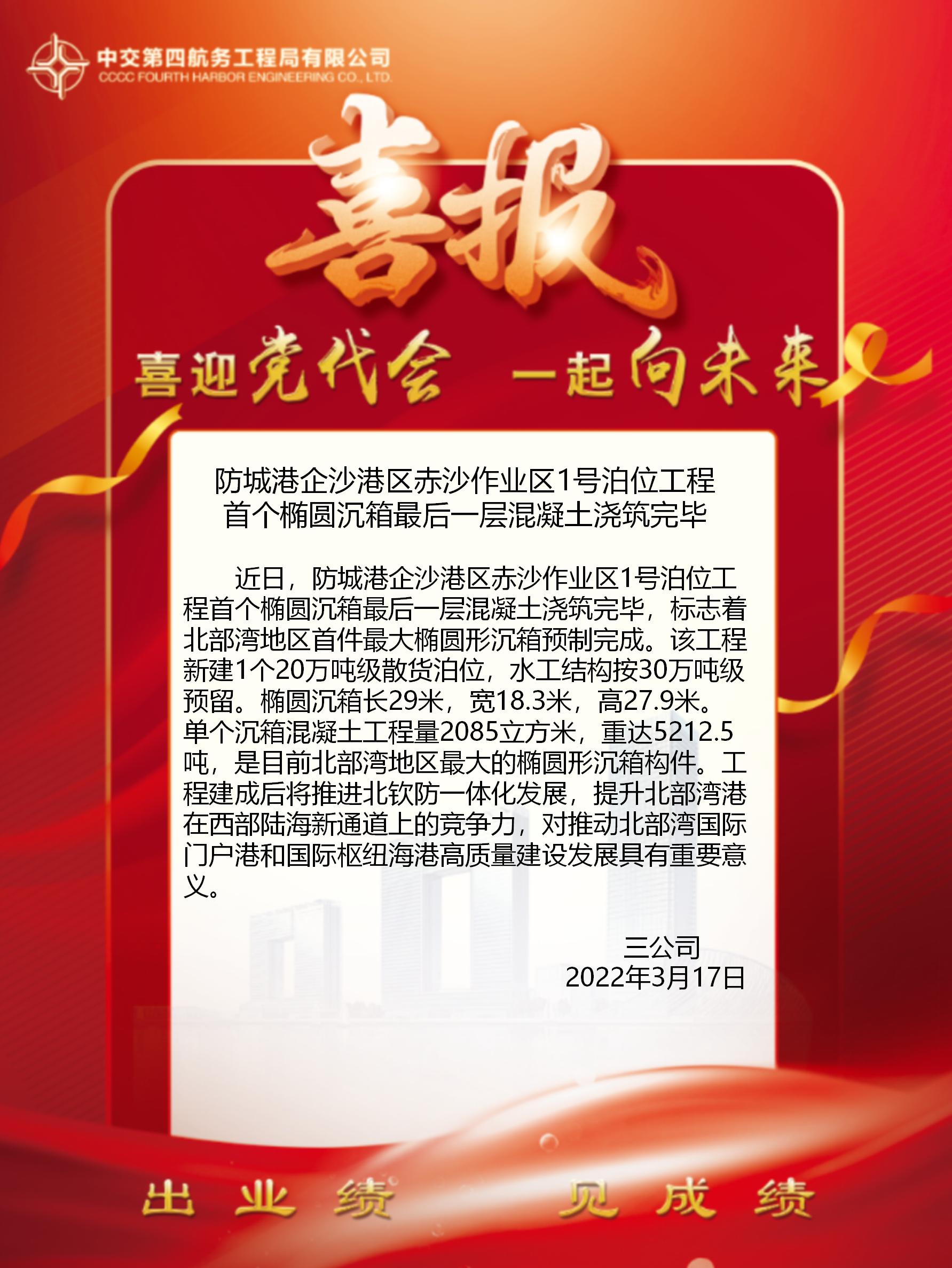 防城港企沙港區(qū)赤沙作業(yè)區(qū)1號泊位工程 首個橢圓沉箱最后一層混凝土澆筑完畢