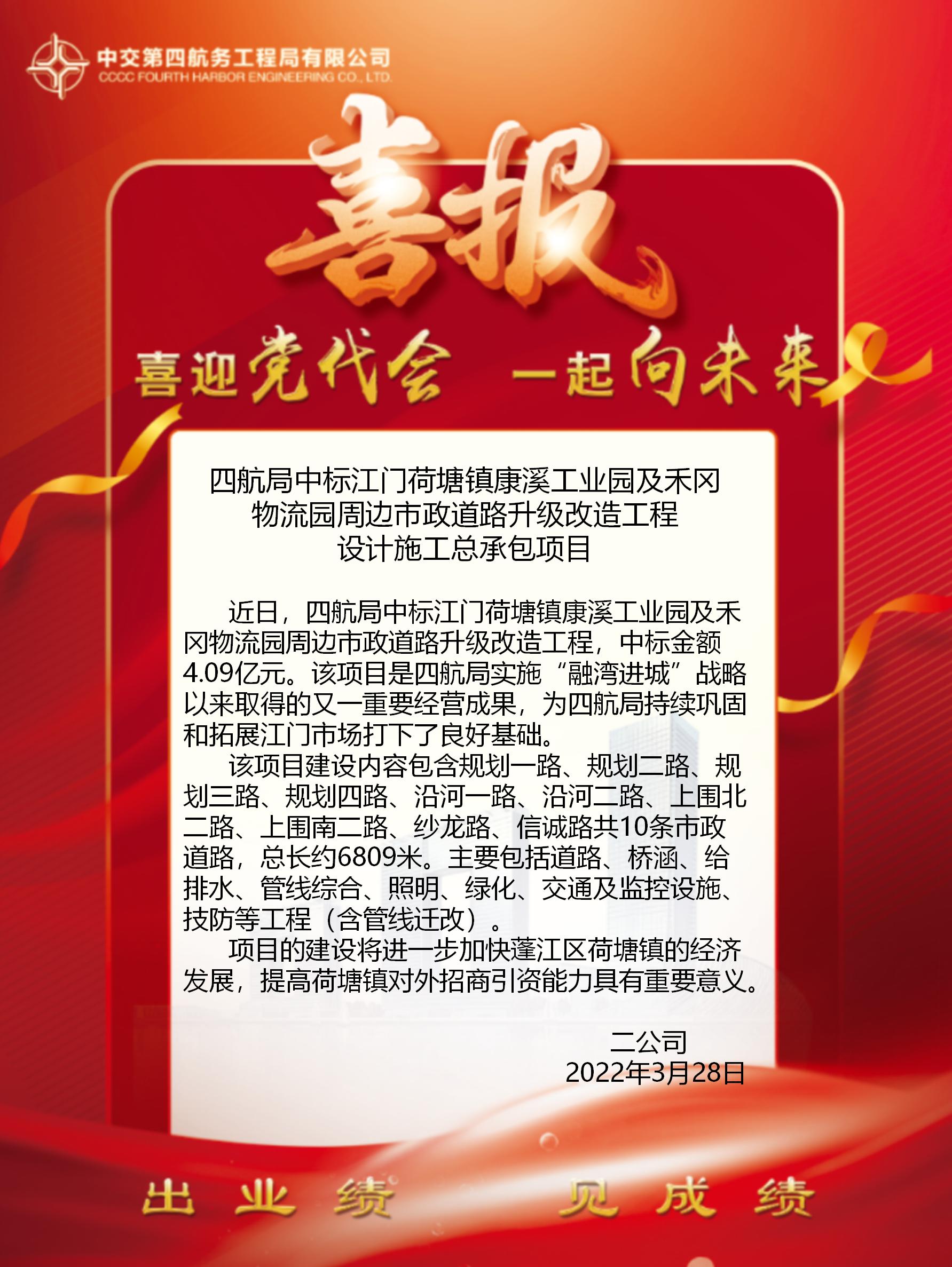 四航局中標江門荷塘鎮(zhèn)康溪工業(yè)園及禾岡物流園周邊市政道路升級改造工程設(shè)計施工總承包項目