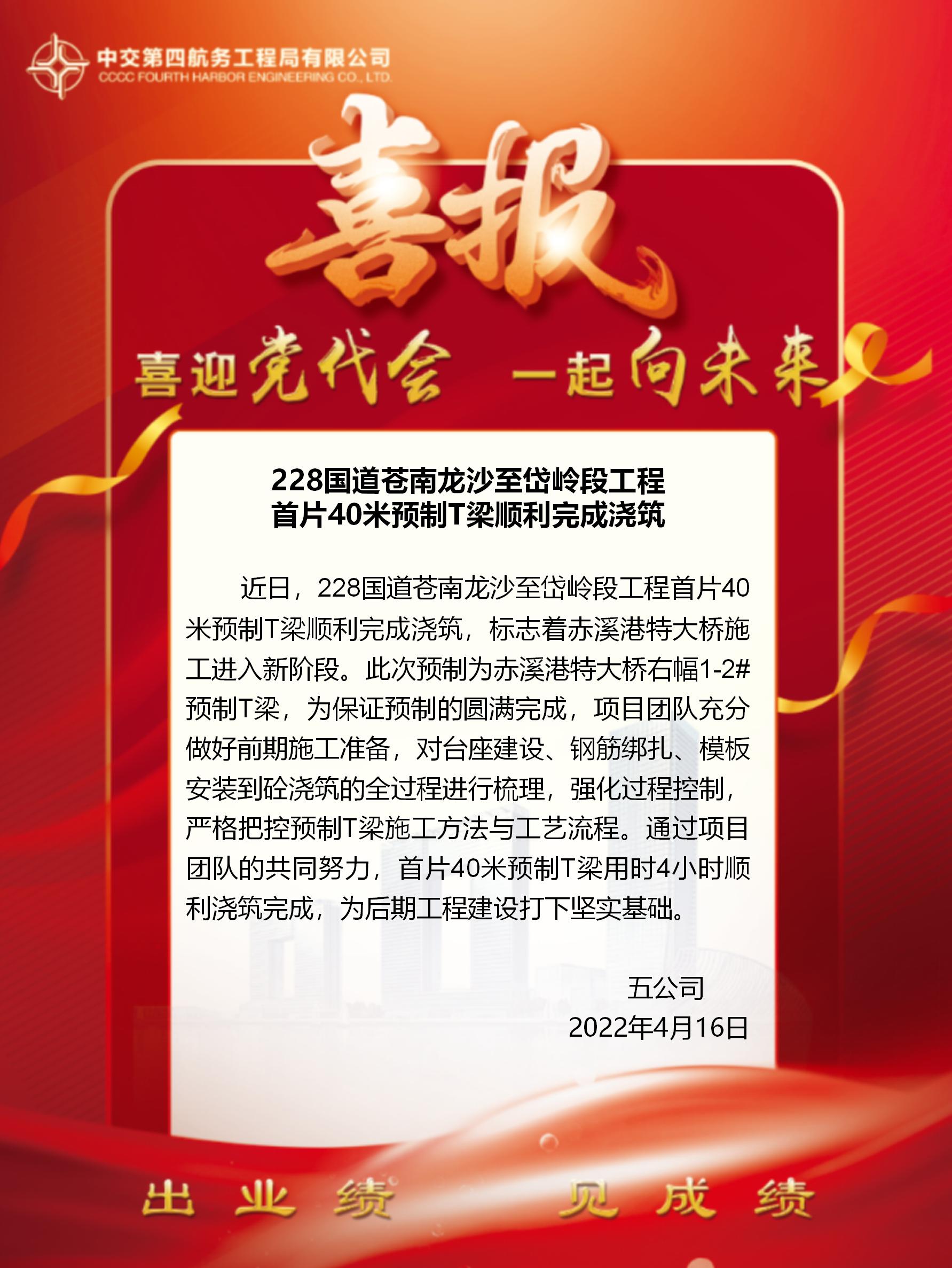 228國(guó)道蒼南龍沙至岱嶺段工程首片40米預(yù)制T梁順利完成澆筑
