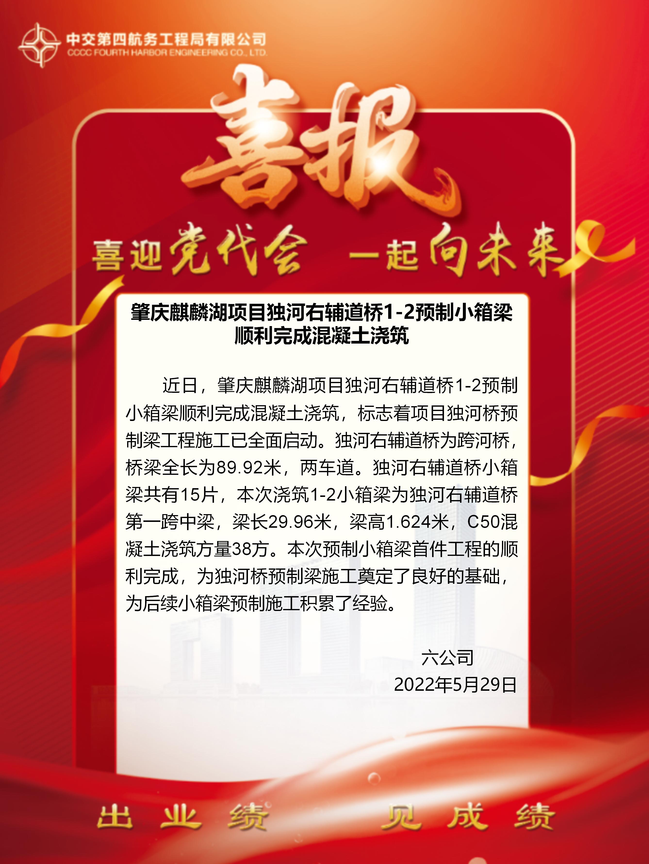 肇慶麒麟湖項(xiàng)目獨(dú)河右輔道橋1-2預(yù)制小箱梁順利完成混凝土澆筑