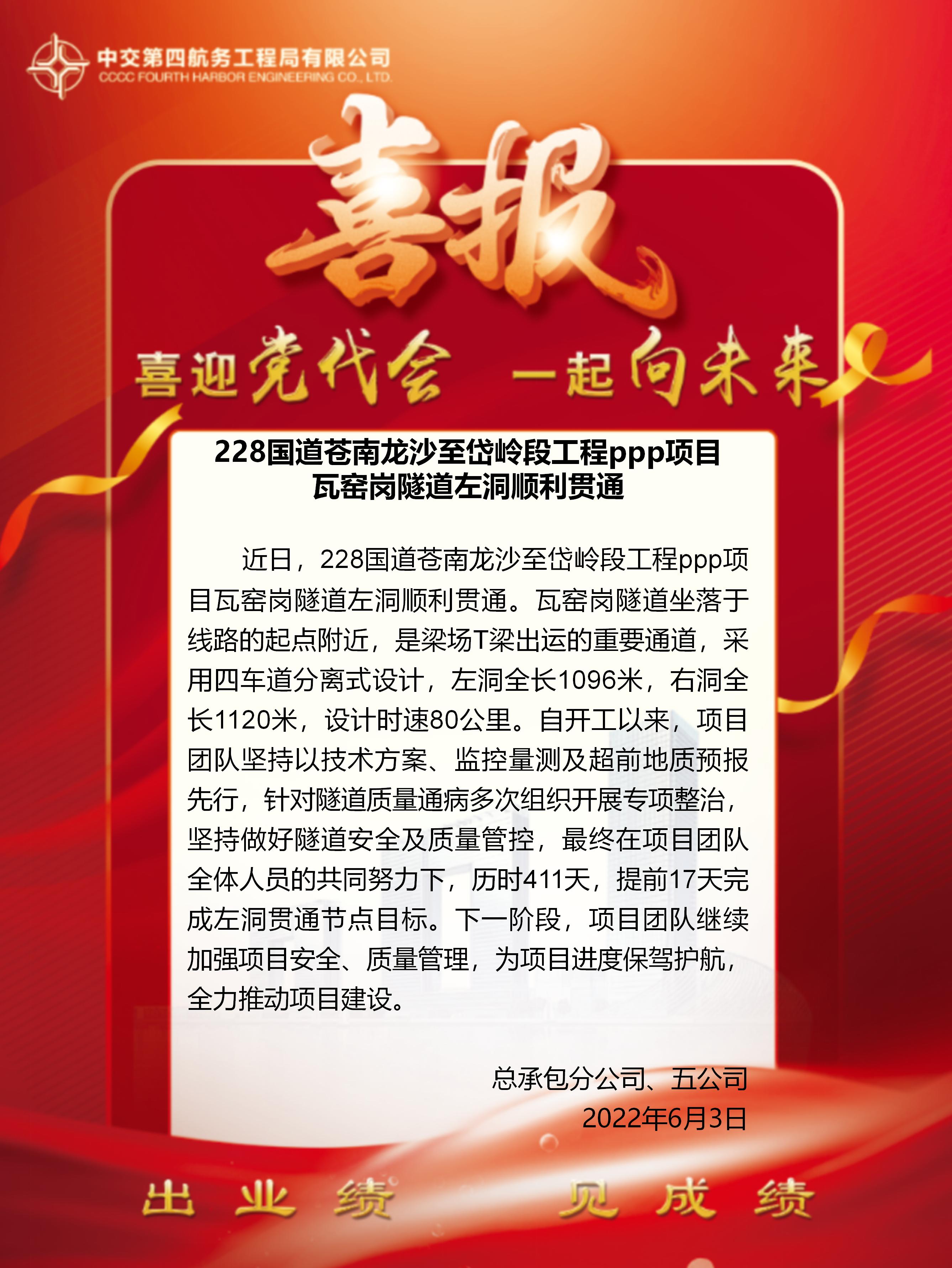 228國(guó)道蒼南龍沙至岱嶺段工程ppp項(xiàng)目瓦窯崗隧道左洞順利貫通