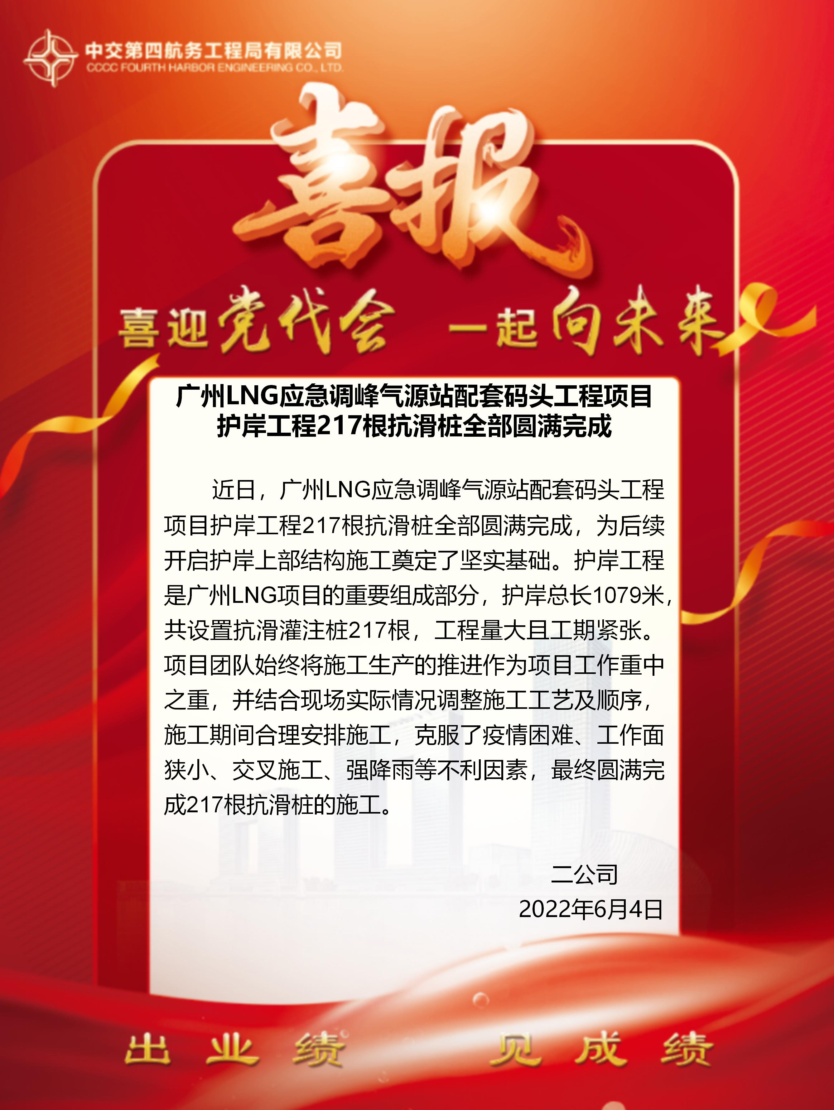 廣州LNG應(yīng)急調(diào)峰氣源站配套碼頭工程項目護岸工程217根抗滑樁全部圓滿完成