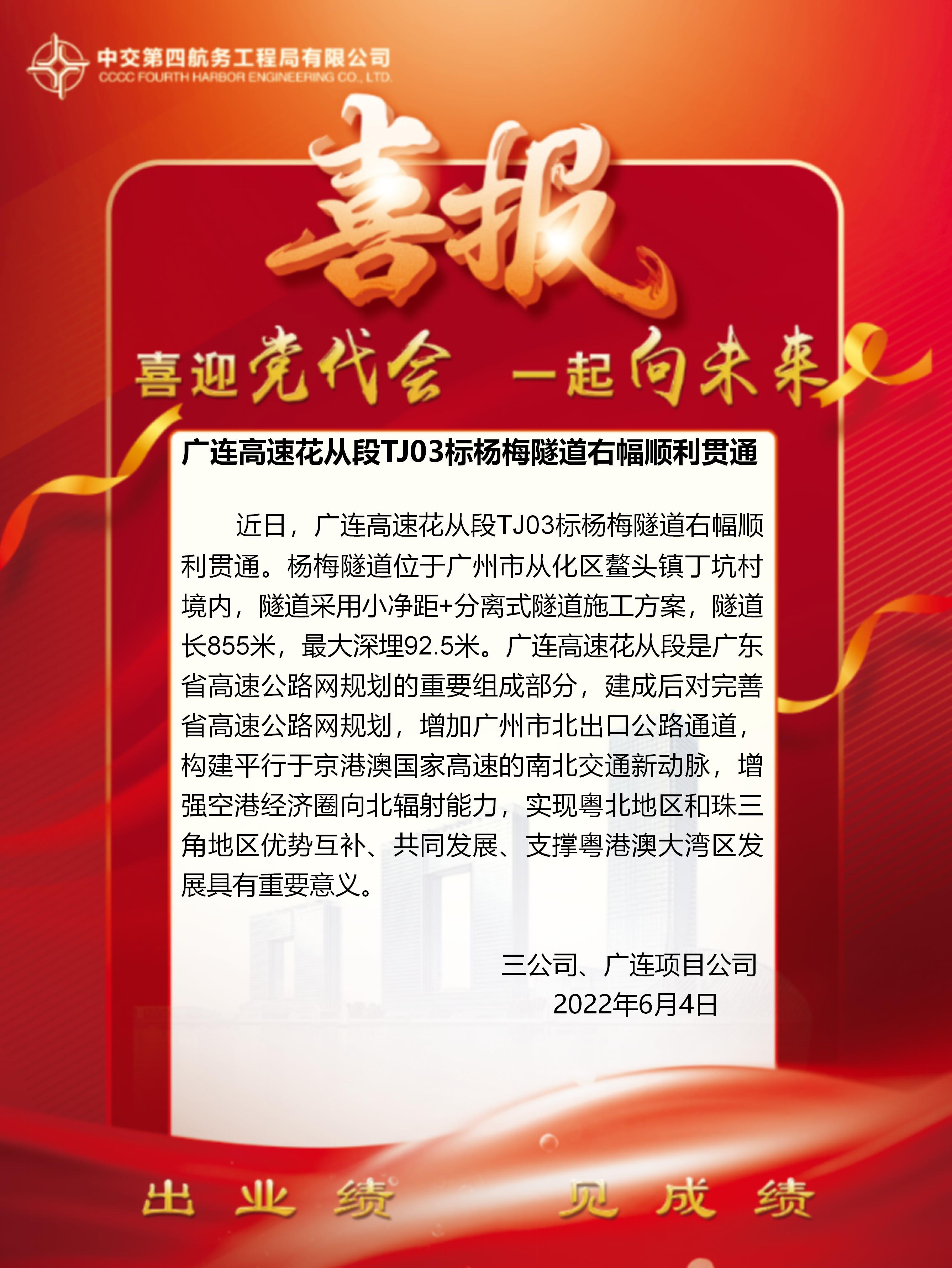 廣連高速花從段TJ03標(biāo)楊梅隧道右幅順利貫通