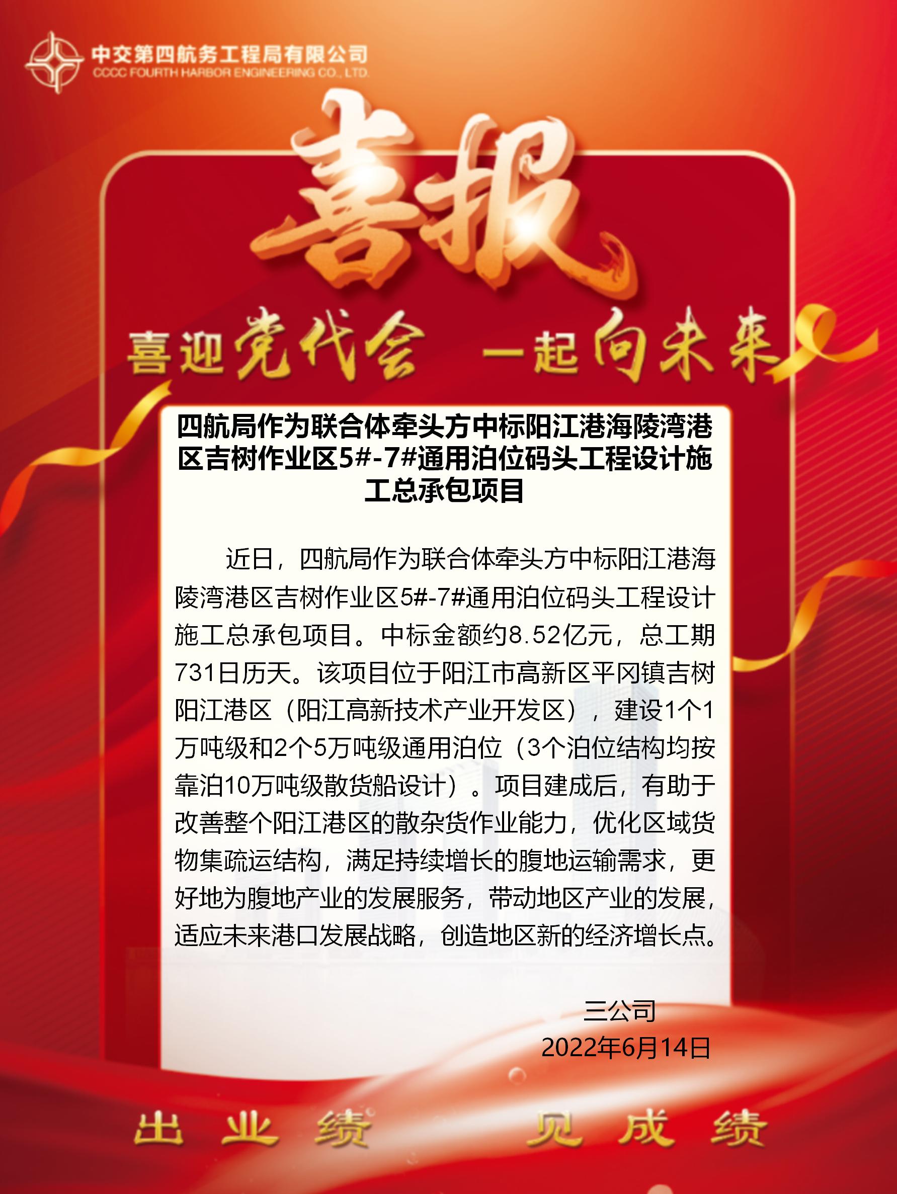 四航局作為聯(lián)合體牽頭方中標(biāo)陽(yáng)江港海陵灣港區(qū)吉樹作業(yè)區(qū)5#-7#通用泊位碼頭工程設(shè)計(jì)施工總承包項(xiàng)目
