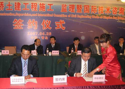 4月26日上午,青島海灣跨海大橋工程建設(shè)合同簽約儀式在青島市協(xié)和華天酒店舉行,梁卓仁董事長(zhǎng)代表承建單位四航局與業(yè)主--山東高速集團(tuán)青島高速公路有限公司正式簽約。