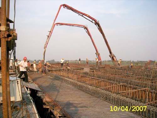 2007年10月4日上午11:30,在廣明高速西樵至更樓段第二合同段SG3標荷城互通的跨路架空支架施工面上,經(jīng)過多方精心部署,左幅第一施工段底護板開始作業(yè),方量430多立方的高標號現(xiàn)澆箱梁混凝土經(jīng)過兩臺泵車近12小時的連續(xù)作戰(zhàn)連續(xù)澆筑,順利完成,為項目部提出"大干一百天,順利完成今年公司下達的目標"奠定了基礎。