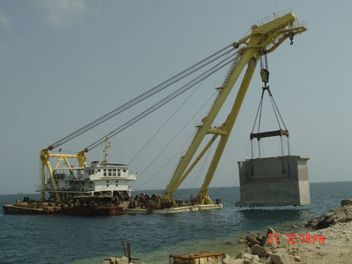 該項目位于蘇丹港港區(qū)進出口航道的口門處,是整個進出港口船舶的必經之路,且該處航道狹小,船舶進出頻繁,加上該處常風方向為寬廣的紅海,掩護條件差,風浪集中,給施工帶來了一定的難度,這期間尤其是對基床拋石和起重安裝作業(yè)干擾和影響大。由于該項目起重安裝及水上拋填工作量大,作業(yè)時間長,給施工安全也帶來嚴峻考驗。第一個節(jié)點的順利完成,給項目部增加了不少信心,現(xiàn)全體成員以高昂的斗志,往項目部的下一個目標--完成12萬方基床拋石進發(fā)。