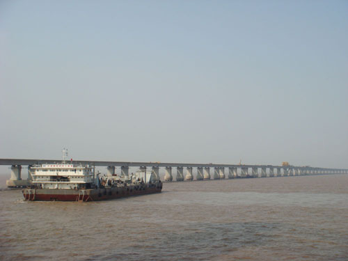 金塘大橋項(xiàng)目部的全體員工在認(rèn)真做好防御臺(tái)風(fēng)、寒潮大風(fēng)的同時(shí),抓住一切有利時(shí)機(jī),見(jiàn)縫插針地組織箱梁安裝工作,在有限的施工條件下發(fā)揮最大的安裝效率,至2007年11月8日止,共已完成箱梁安裝245片,占需安裝箱梁總數(shù)470片的52%。