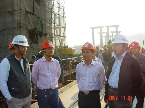 梁卓仁首先察看了富灣特大橋55、56號(hào)主墩工區(qū),他對(duì)富灣大橋項(xiàng)目部想方設(shè)法克服"7.18沉船撞塌施工棧橋事件"、"樁基施工溶洞處理"等困難,保證施工進(jìn)度表示肯定;之后,他到廣明高速3、4標(biāo)工地,對(duì)該標(biāo)段自6月以來(lái)在業(yè)主組織的勞動(dòng)競(jìng)賽中爭(zhēng)先創(chuàng)優(yōu)、確保進(jìn)度的表現(xiàn)給予肯定。