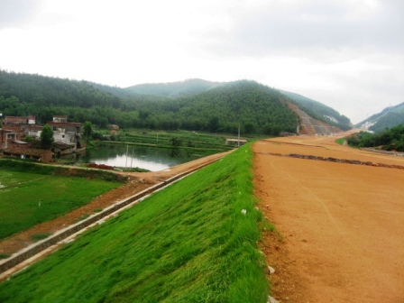 在施工過程中,廣明高速公路第二合同段著力強(qiáng)調(diào)"環(huán)保"、"綠色"、"生態(tài)"的設(shè)計(jì)和施工理念。在路基施工中,明確"預(yù)防為主,保護(hù)優(yōu)先"的環(huán)保施工原則,嚴(yán)格按照邊開挖、邊整修、邊防護(hù)、邊恢復(fù)的環(huán)保工藝標(biāo)準(zhǔn),將水土流失控制到最低限度。如對棄土(渣)場邊坡、坡腳在沒有棄土前就先進(jìn)行防護(hù)。在填土高度較高路段,則采用漿砌片石擋墻、護(hù)坡等永久性支擋措施。對棄土場,則要求先砌好擋土墻和排水溝,然后再棄渣棄土。