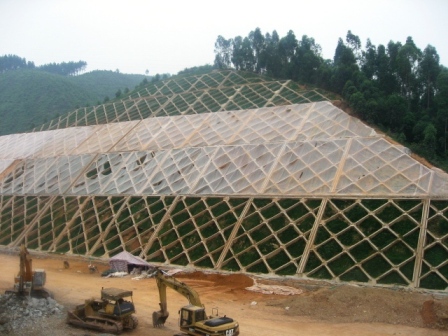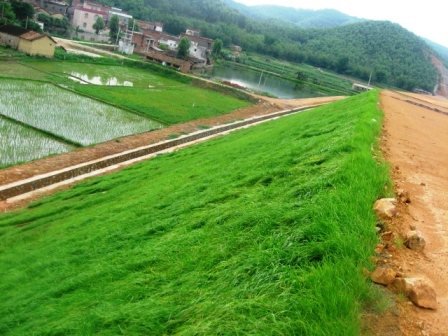 在施工工藝上,嚴(yán)格按照"綠化因地制宜"的生態(tài)原則,制定了因邊坡高度不同、邊坡土質(zhì)不同、填挖方不同而不同的生態(tài)綠化方案。對基質(zhì)為石質(zhì)的路塹邊坡和基質(zhì)為破碎風(fēng)化石的邊坡,分別采用"土工格室、客土噴播植草防護(hù)"與"三維網(wǎng)與噴播植草防護(hù)"兩種不同的施工工藝,既穩(wěn)固了邊坡,也使邊坡完全被植被覆蓋。