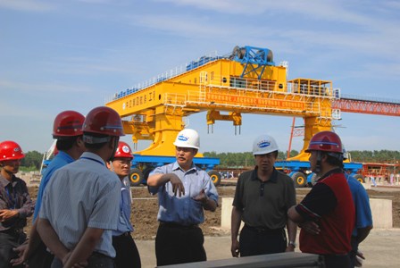 6月25日,哈大鐵路公司常務(wù)副經(jīng)理劉忠憲、總工程師趙世運(yùn)一行在中交哈大指揮部常務(wù)副指揮長馬新安、四航局副總經(jīng)理周達(dá)培一行的陪同下,到四航局哈大經(jīng)理部施工現(xiàn)場視察。
