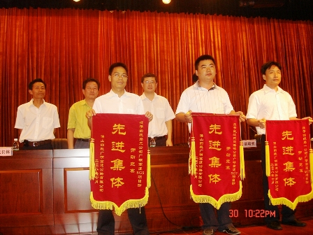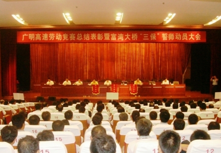 為了表彰先進(jìn)、鼓舞士氣,充分調(diào)動(dòng)廣大建設(shè)者的積極性,確保廣明高速公路明年4月建成通車,7月30日,廣明公司隆重舉行"廣明高速公路勞動(dòng)競(jìng)賽總結(jié)表彰暨富灣大橋‘保安全、保質(zhì)量、保工期’三保誓師大會(huì)",對(duì)上階段"四比四賽"勞動(dòng)競(jìng)賽活動(dòng)中涌現(xiàn)的先進(jìn)集體和個(gè)人進(jìn)行表彰,為富灣大橋項(xiàng)目部青年突擊隊(duì)授旗。廣明高速公路各參建單位共300多人參加。