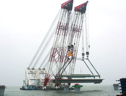 8月18日,青島海灣大橋工程第一片重達2000噸的60米箱梁安裝成功,標(biāo)志著該工程水上作業(yè)正式開始。