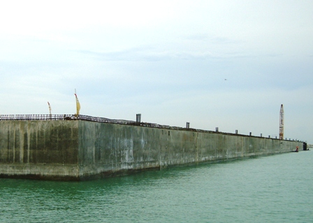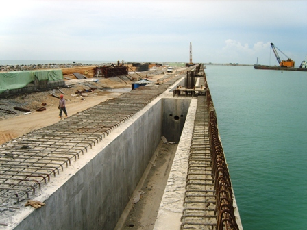 自今年7月19日開(kāi)始澆筑第一段胸墻以來(lái),該項(xiàng)目部就緊張有序地做好每段胸墻砼澆筑,努力克服八所地區(qū)惡劣季風(fēng)氣候?qū)κ┕ぷ鳂I(yè)的影響,克服原材料漲價(jià)和供應(yīng)緊張的影響,見(jiàn)縫插針,積極創(chuàng)造條件。通過(guò)項(xiàng)目部的努力拼搏,用不到45天的時(shí)間安全高效地完成了17段碼頭胸墻砼共7500立方米的澆筑。
