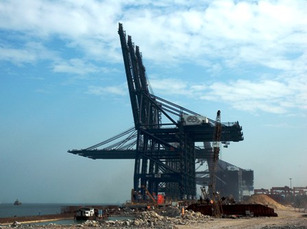 先進(jìn)岸吊與擴(kuò)建工程的深水泊位相結(jié)合,將達(dá)到"好馬配好鞍"的理想效果。這批岸吊與擴(kuò)建工程其他雙起升岸吊相同,為目前世界上最大、最新型的起重機(jī)械,單機(jī)重達(dá)2000多噸,長(zhǎng)長(zhǎng)的吊臂可向前方伸出65米,操作23排寬世界最大型集裝箱船舶。