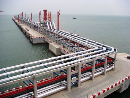 中國石油廣西石化10萬噸級原油碼頭工程位于廣西欽州港鷹嶺作業(yè)區(qū)內(nèi),工程造價(jià)為2.78億元,總工期為13個(gè)月,工期之緊為華南港工碼頭建設(shè)以來之罕有。其建設(shè)規(guī)模為2個(gè)10萬噸級原油卸船泊位、2個(gè)5千噸級和2個(gè)3千噸級的成品油卸船泊位。碼頭全長609米,寬36米,整個(gè)碼頭呈"L型"布置,碼頭為離岸重力式結(jié)構(gòu)。