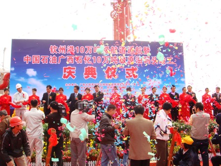 中國石油廣西石化10萬噸級原油碼頭竣工慶典儀式于12月6日在欽州港隆重舉行。廣西壯族自治區(qū)人大副主任覃瑞祥、自治區(qū)副主席陳武、廣西北部灣國際港務(wù)集團(tuán)董事長葉時(shí)湘以及欽州市委、市人民政府等領(lǐng)導(dǎo)同志出席了慶典儀式。中石油廣西石化總經(jīng)理吳恩來在慶典致詞上高度贊揚(yáng)了三公司欽州港項(xiàng)目部攻堅(jiān)克難并提前32天將碼頭交付使用、為欽州石化項(xiàng)目如期投產(chǎn)奠定了良好的基礎(chǔ)表示感謝!