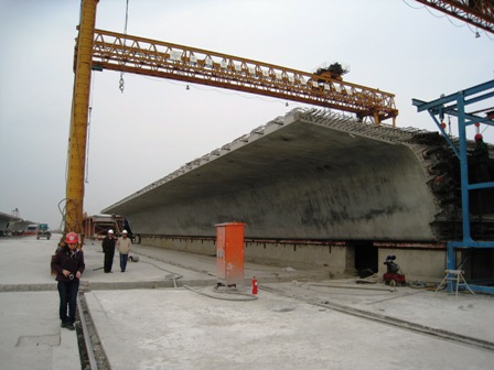 二公司承建的青島海灣大橋第12合同段,是整個(gè)大橋建設(shè)的最大標(biāo)段,主要負(fù)責(zé)376片長(zhǎng)60米、寬17米、重2080噸大型箱梁的整體預(yù)制、運(yùn)輸和吊裝。這標(biāo)志著四航局乃至中交股份在跨海大橋建設(shè)中取得新突破,實(shí)現(xiàn)了大型箱梁的預(yù)制、運(yùn)輸和吊裝一體化施工。