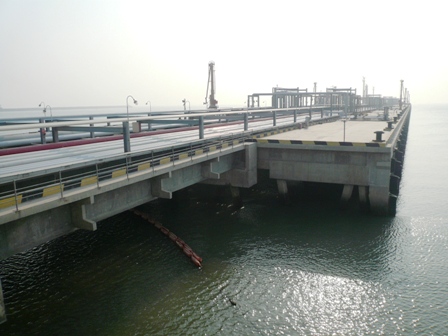 該工程由2個(gè)8萬噸級(jí)泊位(南側(cè)的8萬噸級(jí)泊位水工結(jié)構(gòu)按靠泊位15萬噸級(jí)船舶設(shè)計(jì))和4個(gè)5000噸級(jí)石化泊位(水工結(jié)構(gòu)按靠泊1萬噸級(jí)船舶設(shè)計(jì))組成,為突堤高樁梁板及高樁墩式結(jié)構(gòu)。