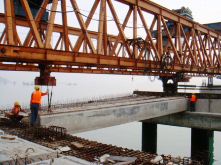 該工程共架設(shè)梁、板505件,構(gòu)件最長(zhǎng)25.36米,最重59噸。采用一臺(tái)30m/80t架橋機(jī),配備一套軌道運(yùn)梁系統(tǒng)進(jìn)行架設(shè)。
