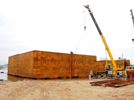 截止4月12日,北江特大橋244#主墩基礎鋼圍堰第一、二節(jié)已制拼完成,第三節(jié)雙壁圍板已完成分塊的制作,準備拼裝。計劃在4月15日左右完成第一、二節(jié)鋼圍堰的浮運工作。