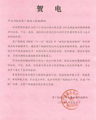 聞?dòng)嵑螅F廣鐵路公司籌備組工程部部長(zhǎng)李建業(yè)、佛山指揮部指揮長(zhǎng)耿浩親臨北江特大橋施工現(xiàn)場(chǎng)指導(dǎo)并宣讀賀電。賀電說(shuō),全線關(guān)鍵控制性工程之一的北江特大橋244號(hào)主墩雙壁鋼圍堰順利安裝、下沉、著床,標(biāo)志著大橋主體工程前期施工正在有序展開(kāi),為全面開(kāi)工奠定了良好的基礎(chǔ)。希望四航局貴廣指揮部全體參建員工再接再厲,充分利用貴廣鐵路這個(gè)平臺(tái),打造"四航"品牌。