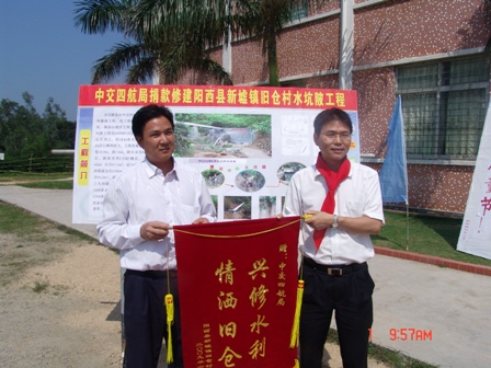 同時,由四航局出資5.6萬元,于5月26日順利完工的舊倉村水坑陂工程竣工儀式同時在活動現(xiàn)場舉行。該工程具有"排、引、灌"等水利三大功能,可解決舊倉村1300多畝農(nóng)田的灌溉問題,為推廣現(xiàn)代化農(nóng)業(yè)夯實了基礎,為確保農(nóng)民增收創(chuàng)造了有利條件。舊倉村黨支部書記馬英深代表舊倉村4628名村民向四航局總經(jīng)理孫國強贈送了錦旗,感謝四航局解決了村民種田"灌溉難"的問題。