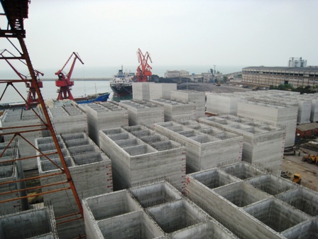 ??诟垴R村港區(qū)擴(kuò)建一期碼頭工程共需要預(yù)制、安裝沉箱75件,于2008年6月26日開始預(yù)制,第一批44件沉箱于2008年11月26日預(yù)制完成。目前,已安裝沉箱60件,胸墻澆筑的各項(xiàng)準(zhǔn)備和其各個工序的施工工作正有條不紊地進(jìn)行。