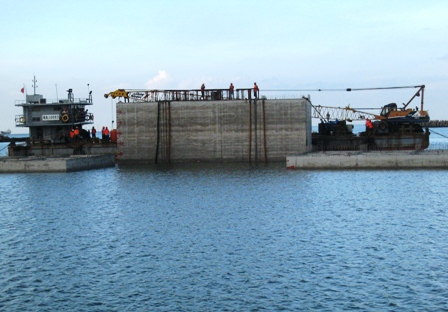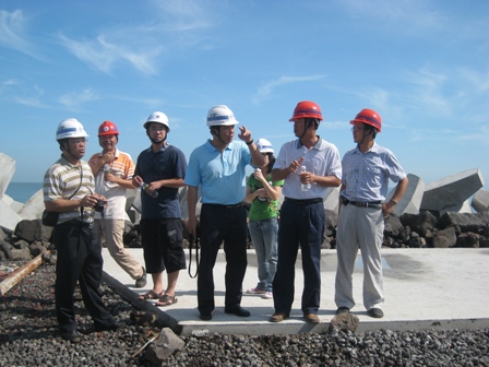 黃副局長(zhǎng)認(rèn)真聽(tīng)取了項(xiàng)目部施工負(fù)責(zé)人的匯報(bào)后,在項(xiàng)目部領(lǐng)導(dǎo)的陪同下,到碼頭施工現(xiàn)場(chǎng)參觀了沉箱出運(yùn)安裝、碼頭后方棱體拋理及倒濾層、護(hù)岸擋浪墻工、扭王塊出運(yùn)及安裝等工序的施工。他指出,項(xiàng)目部沉箱安裝進(jìn)度及質(zhì)量水平相當(dāng)?shù)轿唬瑫r(shí)對(duì)其他正進(jìn)行的各分項(xiàng)施工質(zhì)量、進(jìn)度及安全也表示滿意,希望項(xiàng)目部再接再厲發(fā)揚(yáng)優(yōu)良傳統(tǒng),保質(zhì)、保量、安全地完成下階段施工。