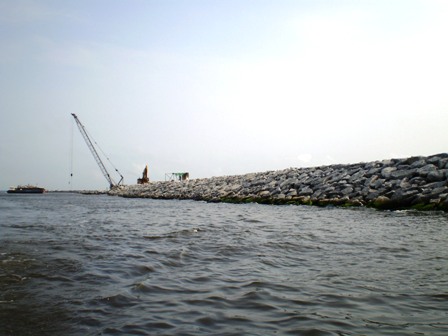 拉各斯防波堤修復工程由東堤、西堤和導流堤組成,其中東堤修復約150米,西堤修復約250米,導流堤修復約500米。從今年2月份開始,該項目部全面鋪開石料開采、扭王塊預制及石料水上運輸拋填等各項工作。隨著下半年尼日利亞國內(nèi)治安形勢有不斷惡化的趨勢和存在不確定的匯率風險,項目部一致認為應(yīng)對目前困難和抓住機遇的最好辦法,就是加快工程進度,多出產(chǎn)值。