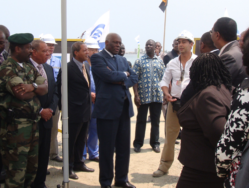9月10日,安哥拉總統(tǒng)多斯桑托斯一行先后到四航局洛比托碼頭修復及擴建工程和洛比托道堆旱碼頭工程視察指導。