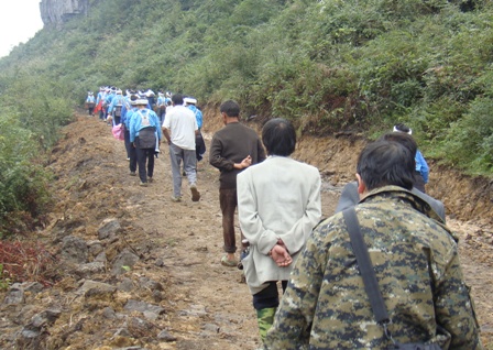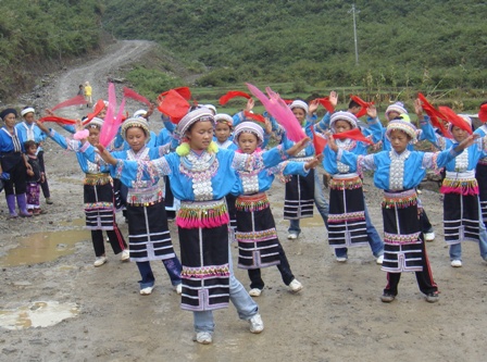 項(xiàng)目部一工區(qū)駐地毗鄰光坡村泡木坪寨,該寨與一工區(qū)進(jìn)場(chǎng)施工便道直線距離約4公里,居住著幾百名苗族村民。由于泡木坪寨被大山環(huán)繞,沒有道路通往外界,村里小孩上下學(xué)及村民進(jìn)出山極為不便,尤其是遇到雨季更是舉步維艱。項(xiàng)目部的人員看在眼里,急在心里,主動(dòng)提出義務(wù)為村民修路,歷時(shí)半個(gè)月完成了一條寬4米,長(zhǎng)5.5公里的山區(qū)鄉(xiāng)村道路。木坪寨村民為感謝四航局,于工區(qū)進(jìn)場(chǎng)便道上樹立"感謝信"宣傳牌,并邀請(qǐng)施工人員到寨里做客。并有40多名村民身著民族服裝,冒著細(xì)雨,自發(fā)性地來到一工區(qū)駐地,為施工人員跳起了民族舞蹈,對(duì)施工人員近半個(gè)月的艱苦努力表示感謝。
