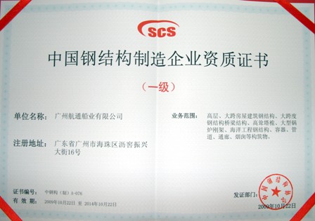 10月22日,廣州航通船業(yè)有限公司榮獲鋼結(jié)構(gòu)制造壹級(jí)資質(zhì),日后可承攬的業(yè)務(wù)范圍包括:高層、大跨房屋建筑鋼結(jié)構(gòu)、大跨度鋼結(jié)構(gòu)橋梁結(jié)構(gòu)、高聳塔桅、大型鍋爐剛架、海洋工程鋼結(jié)構(gòu)、容器、管道、通廊、煙囪等構(gòu)筑物。