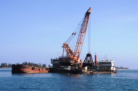 該工程內(nèi)容包含滾裝碼頭基槽及港池挖泥,挖泥斷面層總方量約為97萬方,其中約46萬方的炸礁量,合同工期13個月。鑒于KBR嚴格的管理模式,項目部精心籌備前期工作,合理利用有限資源,及時組織人員設(shè)備進場,提前采購炸藥,確保了項目順利開工。