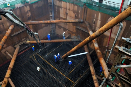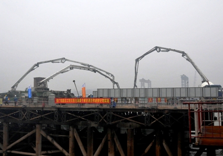 244號主墩承臺長35米,寬17米,高6米,砼方量達3570立方米,單體一次性澆筑方量居四航局之首。面對困難,貴廣三項目部精心組織,多次召開施工動員會和承臺施工技術交底會,認真安排、詳細部署,并組織承臺專項質量安全生產(chǎn)大檢查,確保施工萬無一失。4月18日10時15分,該部兩座攪拌站、四條生產(chǎn)線同時開動全速生產(chǎn),25臺攪拌車、5個卸料點不間斷下料,高峰下料速度達到每小時160立方米以上。經(jīng)過一百多名技術人員的持續(xù)努力,最終比預計時間縮短8小時順利完成澆筑。