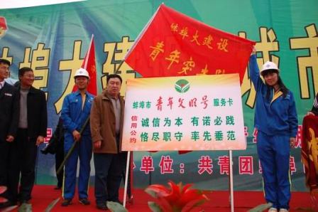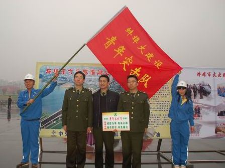 蚌埠項(xiàng)目部青年突擊隊(duì)積極參與主題為"蚌埠大建設(shè),城市新生活"的蚌埠市青年文明號優(yōu)質(zhì)服務(wù)示范月活動,并于4月18日作為交通系統(tǒng)代表,從蚌埠市委常委、常務(wù)副市長張孝成手中接過"蚌埠大建設(shè)青年突擊隊(duì)"隊(duì)旗。