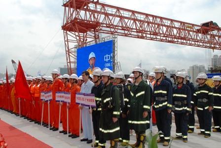 進(jìn)入6月份以后,臺(tái)風(fēng)、暴雨等惡劣天氣將顯著增多,華南地區(qū)各施工項(xiàng)目將面臨重大考驗(yàn)。為切實(shí)落實(shí)"安全第一,預(yù)防為主,綜合治理"的方針,實(shí)地檢驗(yàn)處理突發(fā)事件的能力,6月20日,中交股份在中交四航局承建的廣州市洲頭咀隧道進(jìn)行了一場(chǎng)大型的防臺(tái)風(fēng)、防坍塌實(shí)景模擬大型演練。國(guó)務(wù)院國(guó)資委綜合局副局長(zhǎng)劉源、國(guó)家安監(jiān)總局監(jiān)管二司副司長(zhǎng)王力爭(zhēng)、住房和城鄉(xiāng)建設(shè)部工程質(zhì)量安全監(jiān)管司副司長(zhǎng)王樹(shù)平、國(guó)家應(yīng)急救援指揮中心協(xié)調(diào)部副主任胡學(xué)義、廣州市人民政府副秘書長(zhǎng)張火青、中國(guó)交通建設(shè)股份有限公司副總裁侯金龍、中交四航局總經(jīng)理孫國(guó)強(qiáng)等領(lǐng)導(dǎo)出席此次演練活動(dòng)。