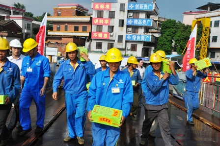 廖汝捷一行親切看望了奮戰(zhàn)在北江特大橋施工第一線的建設(shè)者,并聽取了有關(guān)貴廣項(xiàng)目建設(shè)進(jìn)展的匯報(bào)。廖汝捷對四航局長期以來為廣東省經(jīng)濟(jì)建設(shè)所做出的重大貢獻(xiàn)表示感謝,對高溫下堅(jiān)持為鐵路建設(shè)事業(yè)奮戰(zhàn)的廣大一線員工表示親切慰問。廖汝捷指出,廣東省總工會將努力為企業(yè)在發(fā)展過程中遇到的困難做好服務(wù)、協(xié)調(diào)工作,希望四航局廣大員工繼續(xù)鼓足干勁,大力開展勞動競賽活動,在保證安全生產(chǎn)的同時(shí),按質(zhì)按量完成施工任務(wù)。