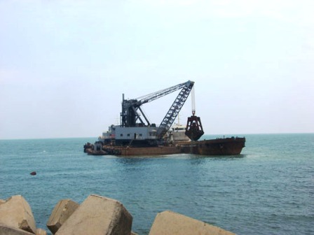 該工程包括2個(gè)1萬噸泊位,可以兼靠3個(gè)5千噸級船舶。工作內(nèi)容包括:3、4號泊位的所有挖泥、炸礁、拋石、夯實(shí)、整平等基礎(chǔ)施工,沉箱預(yù)制、儲(chǔ)存、運(yùn)輸、安裝等所有墻身主體結(jié)構(gòu)施工等。針對該工程土質(zhì)較硬的特點(diǎn),洋浦項(xiàng)目部經(jīng)過充分討論分析后,選擇了斗重為120噸的目前國內(nèi)最大的挖泥船進(jìn)場施工,力爭闊別20多年后在海南洋浦再造精品工程。