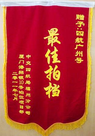近日,福州分公司招銀10號(hào)泊位碼頭工程項(xiàng)目部把一面繡著“四航廣州號(hào)——最佳拍檔”的錦旗送達(dá)三公司,并轉(zhuǎn)達(dá)了該工程業(yè)主、監(jiān)理、項(xiàng)目部對(duì)“四航廣州”號(hào)高效施工的贊揚(yáng)與謝意。
