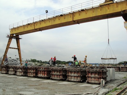 該分項共需預(yù)制12噸立體方塊4054件,自 2010年4月29日開始預(yù)制以來,項目部克服了資金緊張、建筑材料短缺、惡劣天氣等困難,加強人員、機械、物資的調(diào)配,群策群力,高效完成了預(yù)制施工任務(wù)。