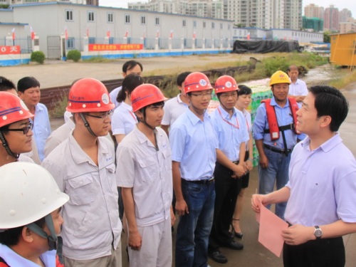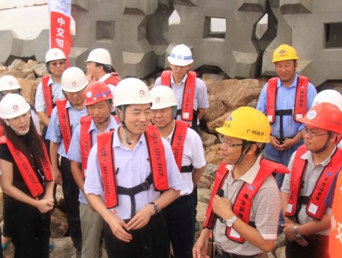 甘霖一行冒雨親臨施工現(xiàn)場(chǎng),聽取了工程介紹,視察了工程進(jìn)展情況,并為港珠澳大橋人工島建設(shè)者送上清涼飲料,勉勵(lì)大家再接再厲,為港珠澳大橋的建設(shè)貢獻(xiàn)力量。
