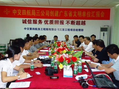 檢查組聽取了文明單位創(chuàng)建匯報(bào),觀看了三公司制作的企業(yè)宣傳片,現(xiàn)場考察了三亞碼頭項(xiàng)目部現(xiàn)場施工情況。雷義指出,三公司文明單位創(chuàng)建工作基礎(chǔ)扎實(shí),亮點(diǎn)紛呈。文明創(chuàng)建與生產(chǎn)經(jīng)營工作結(jié)合緊密,互為促進(jìn)。文明創(chuàng)建滲透到了生產(chǎn)經(jīng)營的各個(gè)環(huán)節(jié),生產(chǎn)經(jīng)營的績效體現(xiàn)了文明創(chuàng)建的成果;企業(yè)文化建設(shè)特色顯著,普通員工對企業(yè)文化的認(rèn)同感很高,企業(yè)文化氛圍濃郁。雷義還用“特別能吃苦,特別能戰(zhàn)斗,特別能奉獻(xiàn)”總結(jié)了對三公司的整體印象。