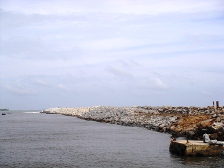 該項目西防波堤施工初期一直處于邊設計、邊修改、邊施工的狀態(tài),直至2010年7月26日,項目部才正式收到西堤最終版施工圖紙。隨后,項目部加強各工區(qū)人員的組織協(xié)調(diào),合理開展水上、陸上石料運輸?shù)裙ぷ?,期間克服了業(yè)主資金不到位、尼日利亞總統(tǒng)大選政治影響、當?shù)刂伟残蝿輴夯?、遭遇特大的天文大潮等困難,邊施工邊想方設法規(guī)避資金、安全風險,全面鋪開西堤施工。