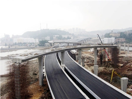 該工程按照城市I級主干道標準設(shè)計與施工,由左右幅兩個主線橋與六個匝道橋組成,雙向六車道,左右兩幅主線橋長共1642米,寬度均為12.75米。為保證橋面瀝青鋪裝層的施工質(zhì)量,項目部在瀝青混凝土配合比、瀝青混凝土溫度、現(xiàn)場施工等各個環(huán)節(jié)進行嚴格控制,有效保證了整體鋪裝施工質(zhì)量。經(jīng)檢測,橋面鋪裝的厚度、壓實度、平整度、滲水系數(shù)、構(gòu)造深度、摩擦系數(shù)等技術(shù)指標均符合設(shè)計及規(guī)范要求,施工進度和質(zhì)量得到業(yè)主、監(jiān)理及質(zhì)監(jiān)站的一致肯定。