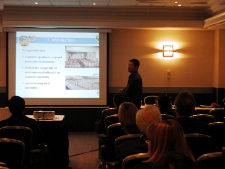 本次會(huì)議圍繞水泥基復(fù)合材料的耐久性問題展開學(xué)術(shù)交流與討論。會(huì)上,四航研究院黎鵬平博士做了題為“The Correlativity between Exposure Test and Accelerated laboratory Test for concrete Performance of Resistance to Chloride ion”的學(xué)術(shù)報(bào)告,報(bào)告主要內(nèi)容是暴露試驗(yàn)與室內(nèi)試驗(yàn)相關(guān)性研究,首次建立了現(xiàn)場耐久性質(zhì)量控制的室內(nèi)快速試驗(yàn)的測試結(jié)果與暴露試驗(yàn)的表觀氯離子擴(kuò)散系數(shù)的關(guān)系,引起參會(huì)者強(qiáng)烈反響。
