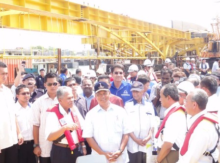丹斯里毛希丁一行遠眺了蜿蜒于海上已成型的大橋,聽取了有關(guān)工程進度及其他相關(guān)情況的匯報。丹斯里毛希丁對檳城二橋建設(shè)總體情況表示滿意,對參建該工程的中方人員給予高度贊揚。