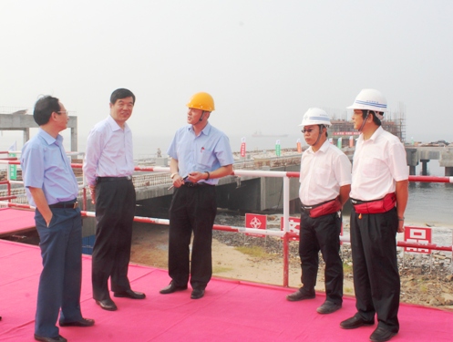 10月10日,寶鋼集團(tuán)有限公司副總經(jīng)理戴志浩、寶鋼湛江鋼鐵有限公司副總經(jīng)理彭俊湘一行到湛江鋼鐵基地30萬噸級(jí)大型散貨碼頭考察施工情況。